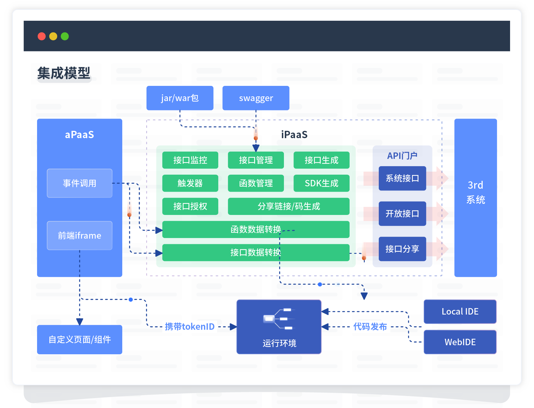 集成模型包括平台本身前、、、后端能力的扩展,,,,也支持通过API门户和第三方系统进行交互。。