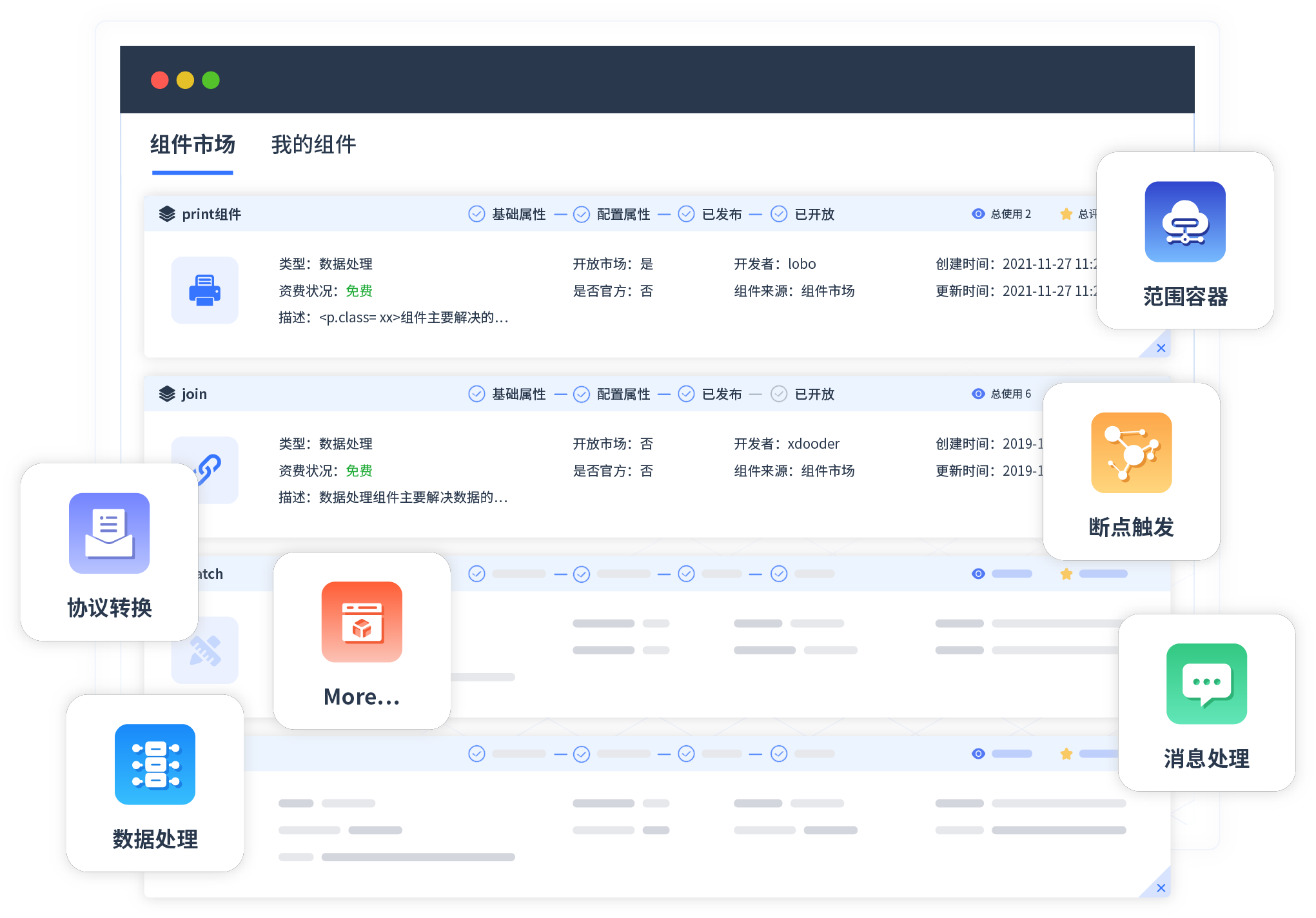 针对集成场景,,,GOPAY钱包提供组件市场,,,,例如协议转换、、、消息处理、、文件操作等。。。除平台提供的组件外,,,,客户可以自定义所需组件。。。