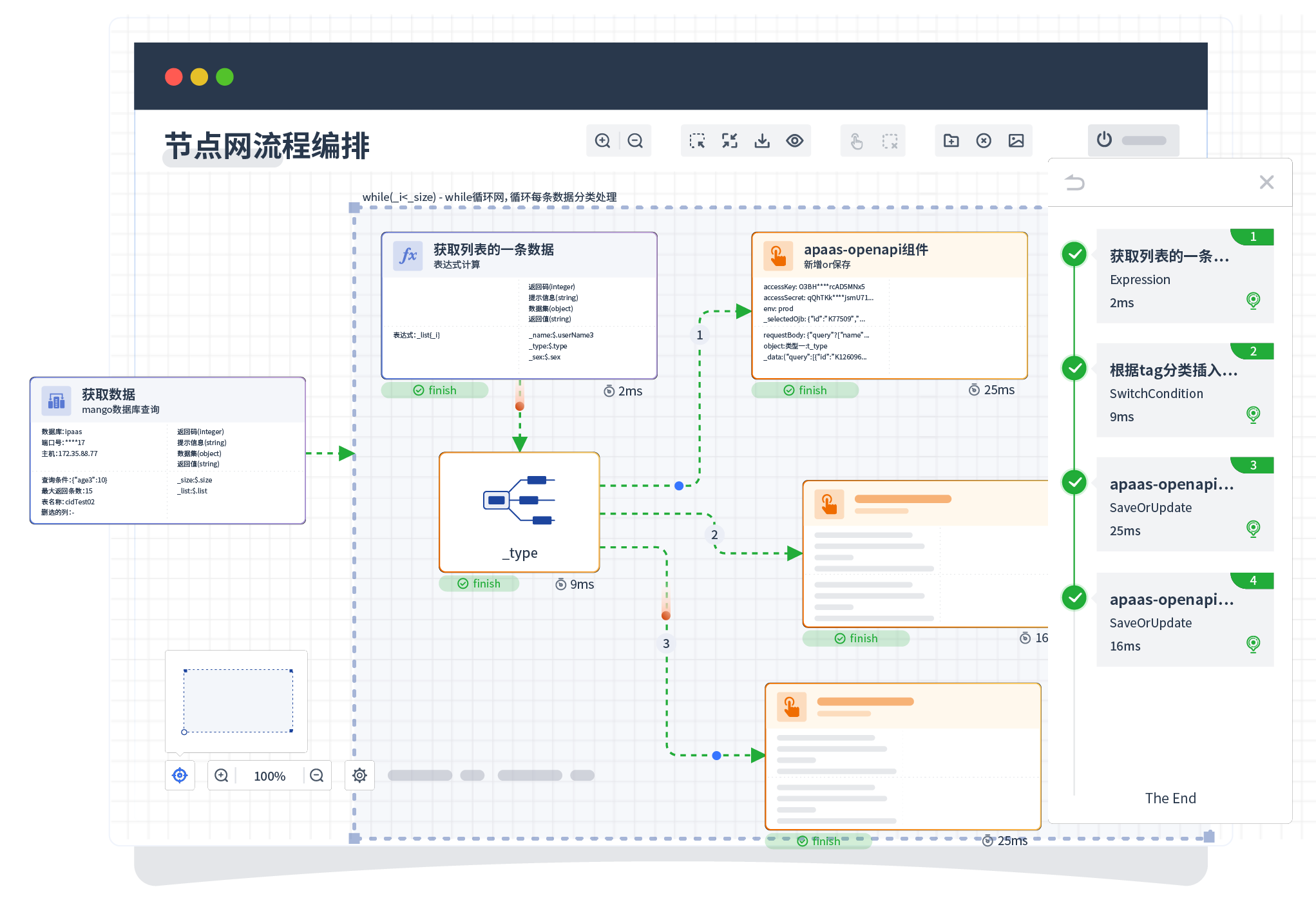 针对集成场景,,,,组件定义后支持进行流程编制,,,,不同于传统代码方式,,,,通过图形化展示,,,支持在线调试、、、日志查看和运行回放。。。