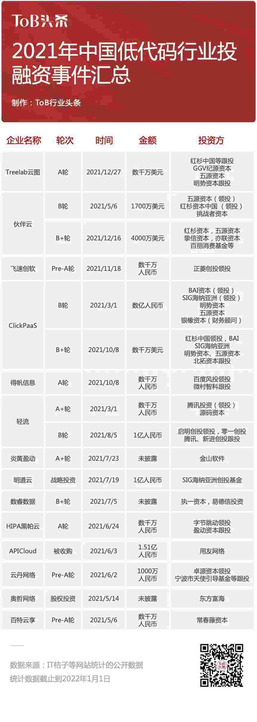 到2021年,,无/低代码投融资规模势头更甚,,,其中包括轻流两轮融资(A+轮数千万人民币,,B轮近亿人民币)、、GOPAY钱包 两轮融资(B轮数亿人民币,,,,B+轮数千万美元)、、、百特云享数千万元Pre-A轮融资......